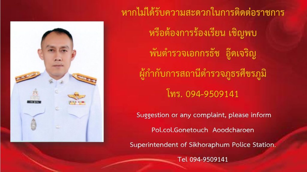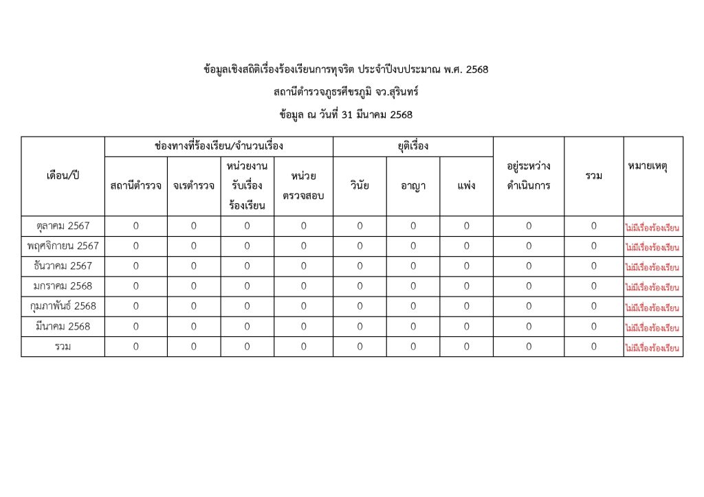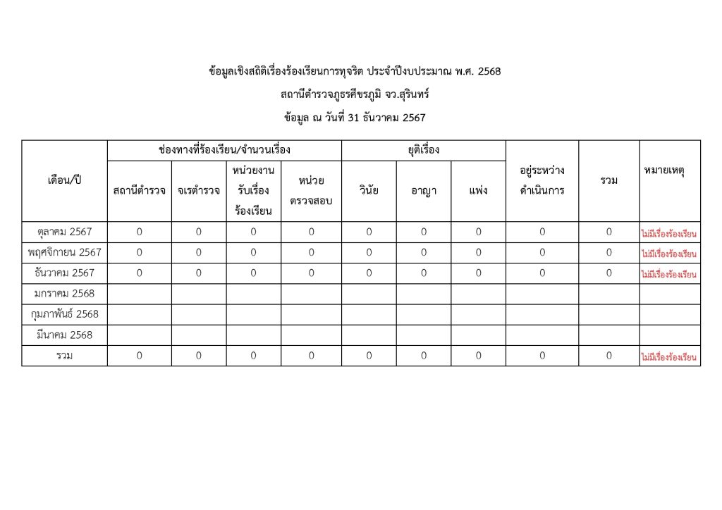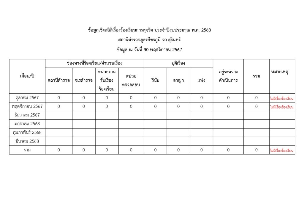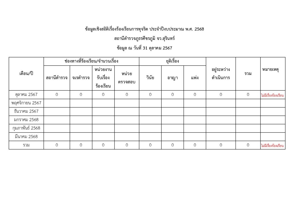 ช่องทางการแจ้งเรื่องร้องเรียนการทุจริตและข้อมูลเชิงสถิติเรื่องร้องเรียนการทุจริตประจำปี 22 พฤษภาคม 2566 โดย admin / มาตรฐานITA ประกาศช่องทางการแจ้งเรื่องร้องเรียนการทุจริต สภ.ศีขรภูมิ Click here ร้องเรียนการทุจริตและประพฤติมิชอบของเจ้าหน้าที่ตำรวจ สภ.ศีขรภูมิ ออนไลน์ click here ดาวน์โหลดแบบฟอร์มแจ้งเรื่องร้องเรียน Click here ข้อมูลเชิงสถิติการแจ้งเรื่องร้องเรียนการทุจริต Facebook iconFacebookTwitter iconTwitterLINE iconLine