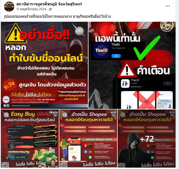 20 ธ.ค.67 งานสอบสวน สภ.ศีขรภูมิ ประชาสัมพันธ์ เตือนภัยหลอกออนไลน์ เรื่องต่างๆ ระวังแก๊งค์มิจฉาชีพ Fa