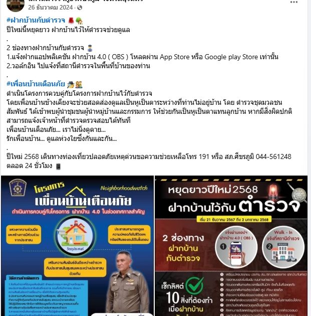 โดยเพื่อนบ้านข้างเคียงจะช่วยสอดส่องดูแลเป็นหูเป็นตาระหว่างที่ท่านไม่อยู่บ้าน โดย ตำรวจชุดมวลชนสัมพันธ์ ได้เข้าพบผู้นำชุมชนผู้นำหมู่บ้านและกรรมการ ให้ช่วยกันเป็นหูเป็นตาแทนลูกบ้าน หากมีสิ่งผิดปกติสามารถแจ้งเจ้าหน้าที่ตำรวจตรวจสอบได้ทันที